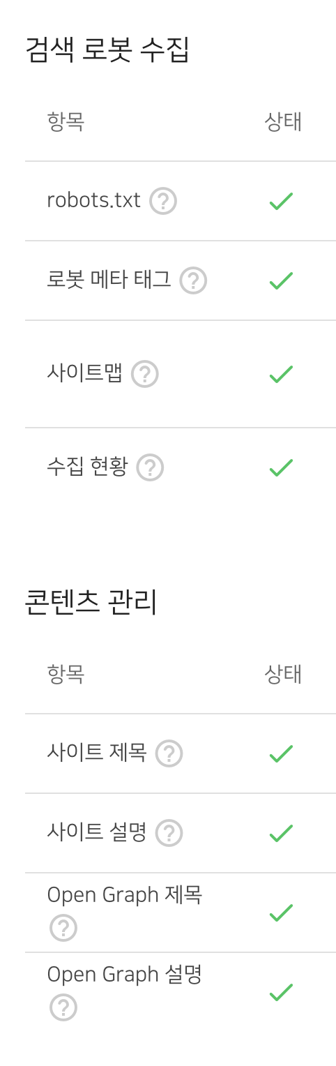 그 다음 개인 블로그를 등록하시고 -> 사이트 관리 -> 리포트 -> 사이트 최적화 상태를 보시면 티스토리 블로그 최적화 상태를 확인할 수 있어요.