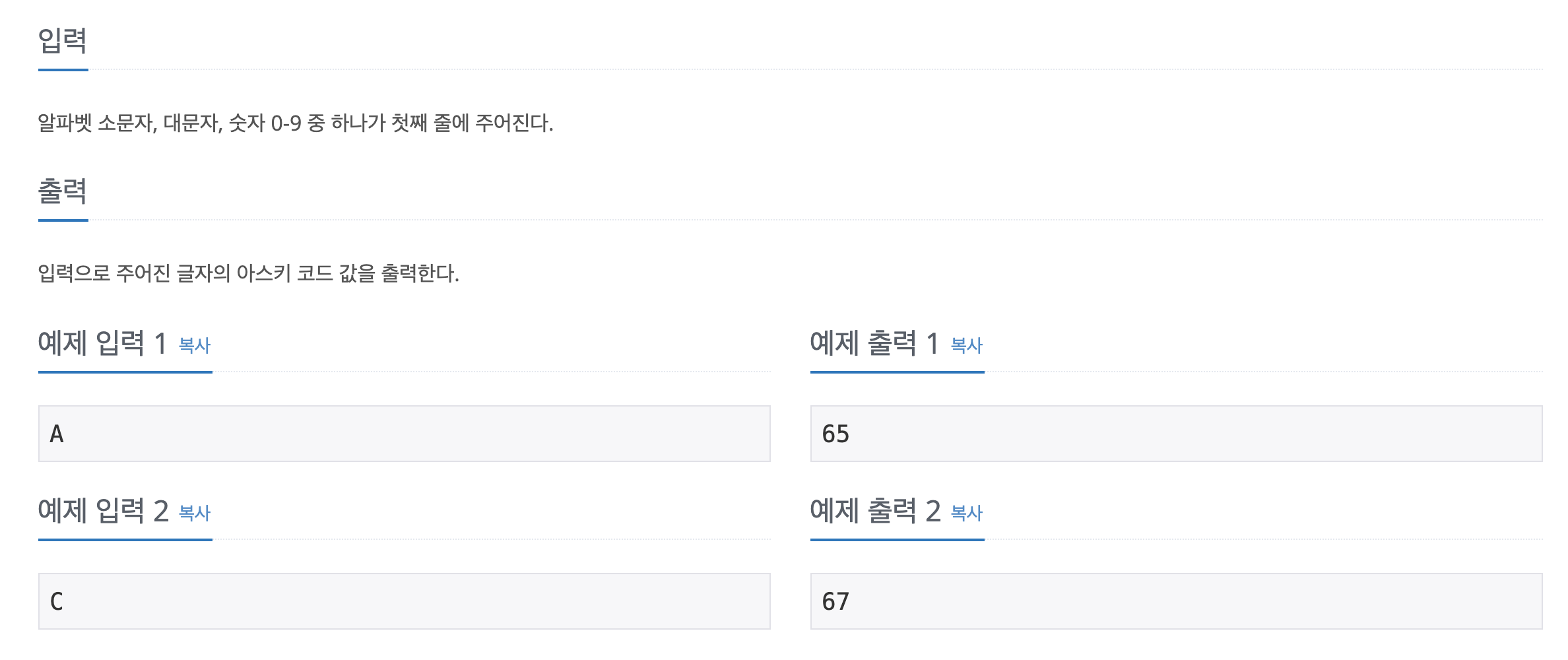 백준 11654 아스키코드 입출력 예시