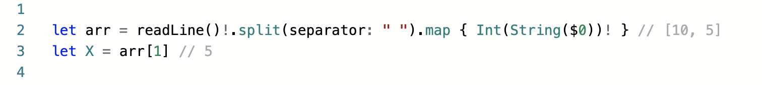 1) 먼저 스위프트 언어로 입력을 받는 부분입니다. 일반적으로 스위프트에서는 입력을 line 단위로 받는데 그때 사용하는 것이 readLine()입니다.