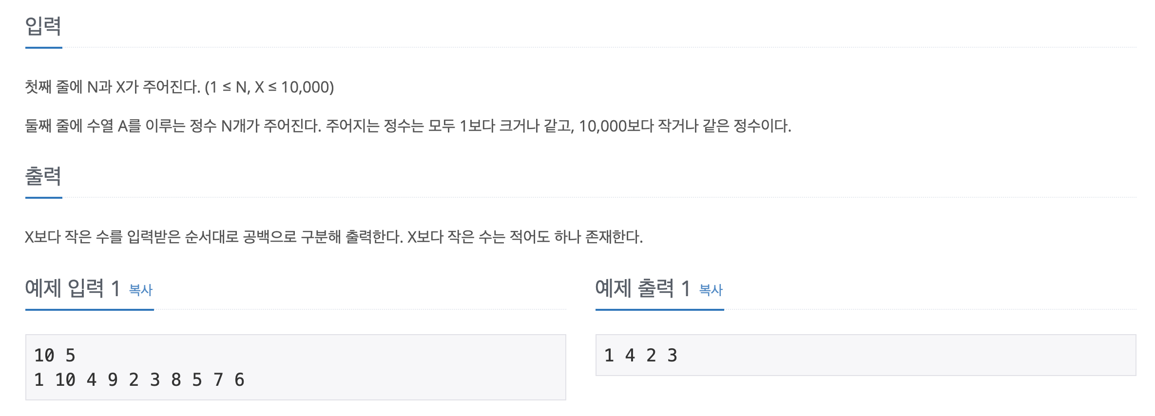 예를 들어봅니다. 먼저, N과 X가 주어집니다. N은 이후 주어질 수열의 숫자 갯수, X는 수열의 값을 추려낼때의 기준이 됩니다. X미만의 값만 남겨서 출력해주면 됩니다.