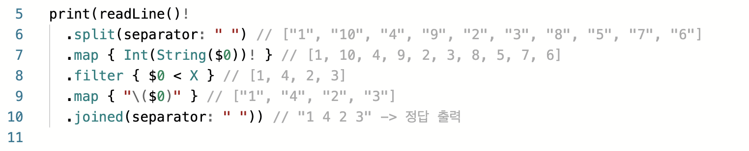 8) .filter { $0 < X } : filter 고차함수는 특정 조건을 충족하는 원소만 추려내서 다시 배열을 만듭니다. $0 < X의 조건을 충족하는 원소만 필터링되어 남게 됩니다. 여전히 타입은 [Int]입니다.