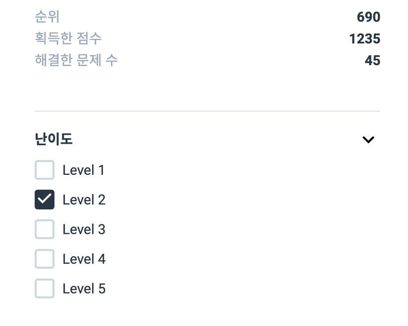 1단계 왕초보수준 알고리즘 문제 위주로 풀었지만... 어느덧 45개의 문제를 풀었습니다. 완전 초보인데.. 순위가 690위라니.. 부끄럽네요. 프로그래머스 유저가 확실히 백준알고리즘 유저에 비해 적음을 느꼈습니다. 백준에서는 몇천위의 순위에 불과하거든요...