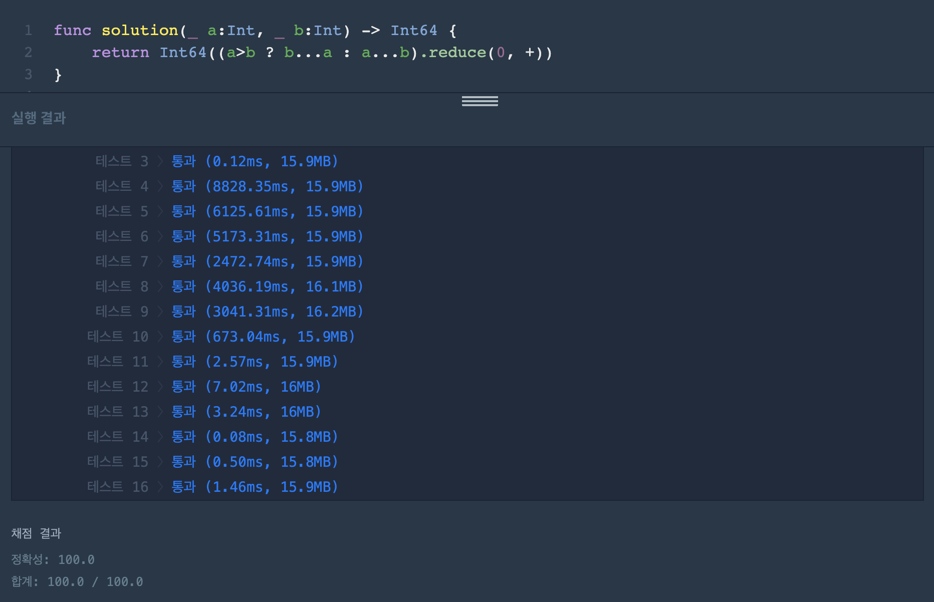 위의 코드는 a > b일 경우 b...a의 범위, b < a일 경우 a...b의 범위의 값을 순차적으로 순회해서 더한 값을 반환하는 코드입니다.