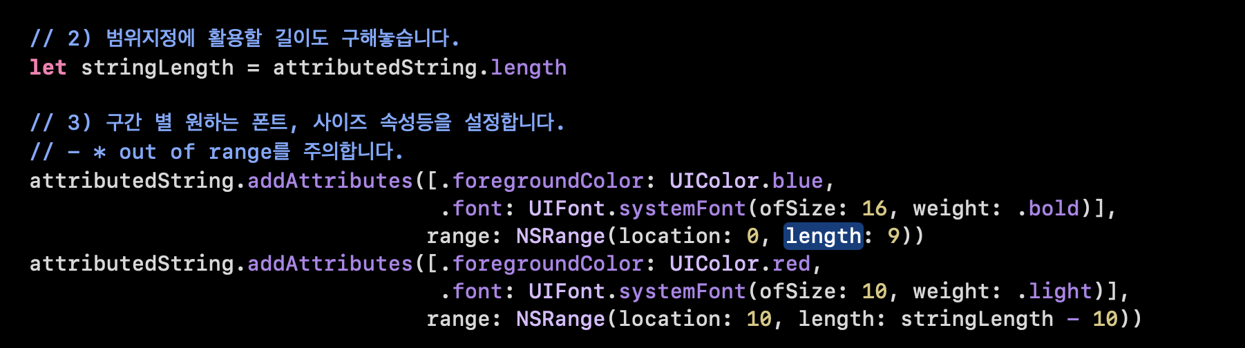 3) 이제 NSMutableAttributedString 인스턴스에 NSRange로 범위를 잡아서 구간별로 텍스트의 폰트, 크기 등 다양한 속성을 추가합니다. 이후 앞서 생성했던 NSMutableAttributedString 인스턴스에 속성을 부여하는 작업을 수행합니다.
