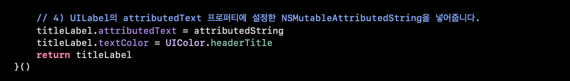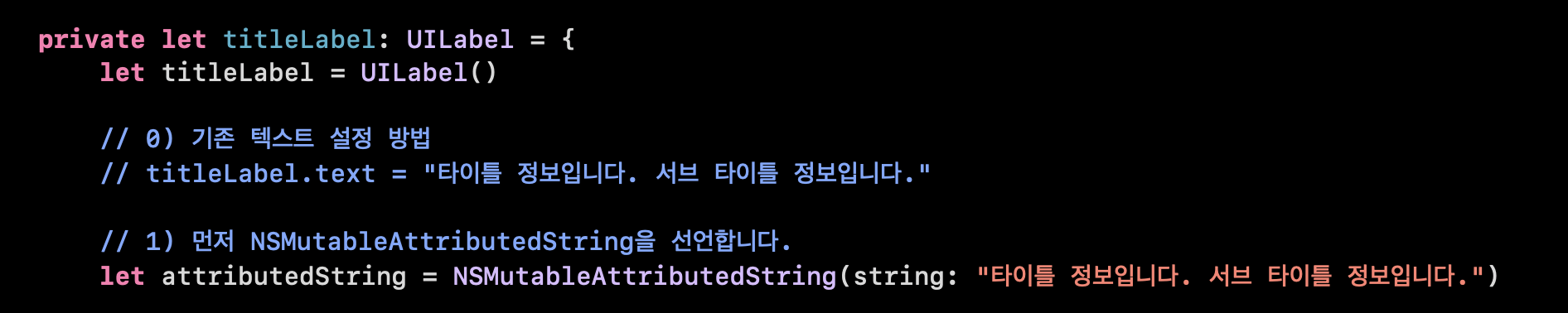1) 이후 앞서 말씀드렸던 NSMutableAttributedString(string:)을 설정하고 있습니다. 첫번째 인자에 기존에 사용하던 문자열을 넣어줍니다.
