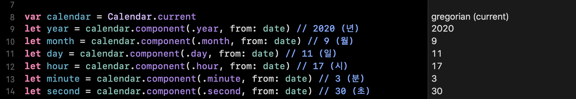 이후에 해당 calendar 변수의 component 옵션을 지정하고, 앞서 생성했던 Date 구조체를 인자로 넣어주면 옵션에 맞는 날짜, 시간값을 얻을 수 있습니다.
