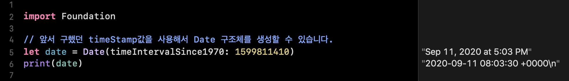 이후에 앞서 얻었던 타임스탬프 값을 통해서 Date 구조체를 생성해줍니다. 생성자의 인자는 timeIntervalSince1970: 라벨의 인자를 사용해줍니다.