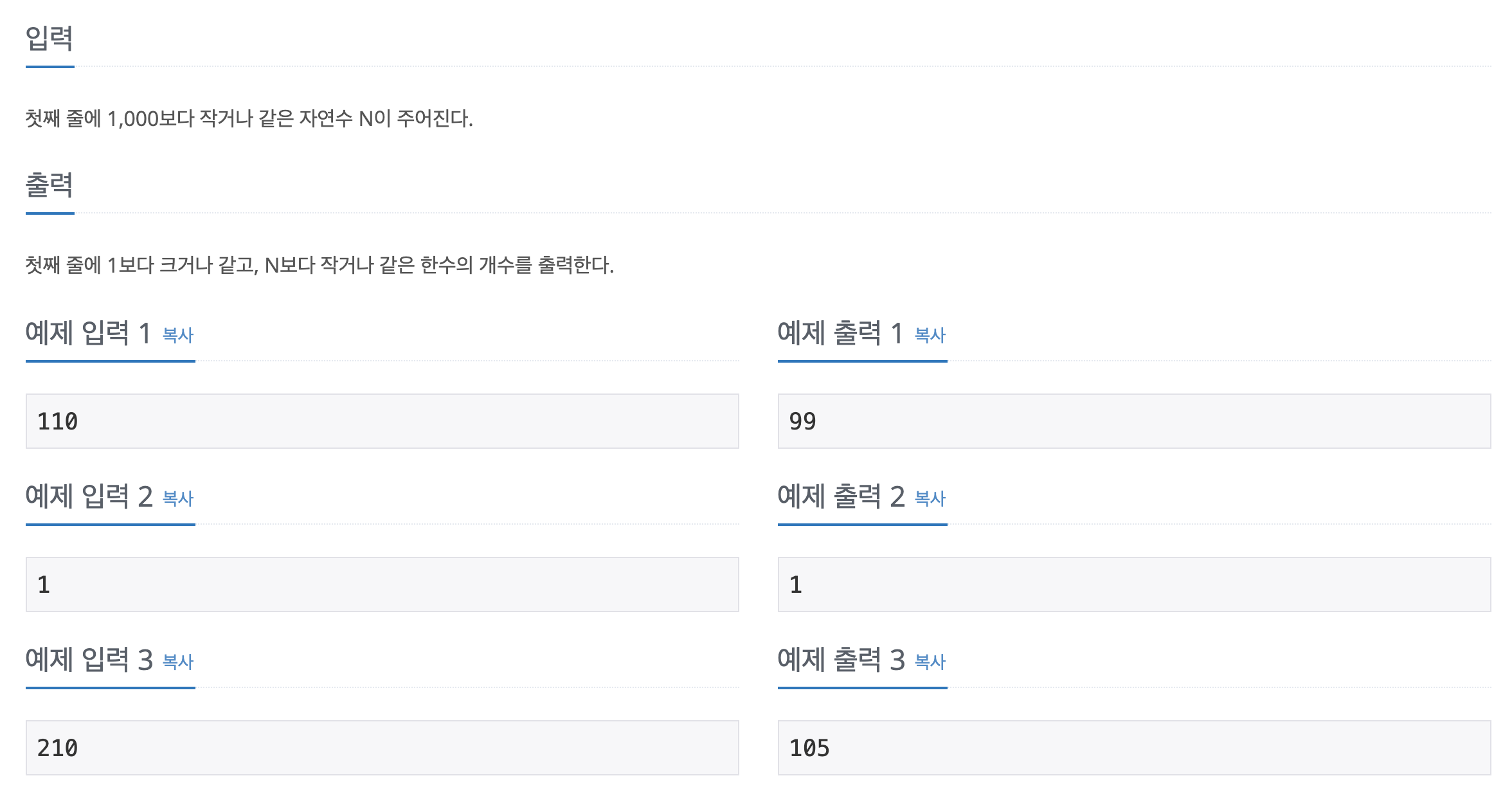 문제의 요지는 이렇습니다. 숫자 N이 입력되었을때, 1 ~ N의 숫자 중 "한수"가 몇개인지 찾아라 입니다!