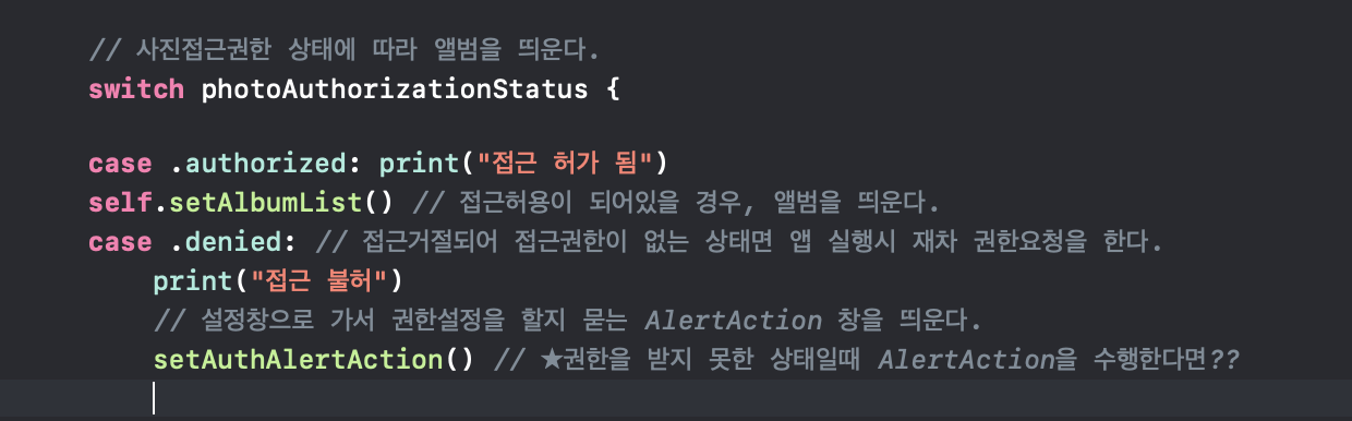 사진첩 권한흭등상태에 따른 분기를 제공하고 있습니다. 권한흭득 상태일 경우 사진첩기능을 사용하여 사진앨범을 뿌려주는데요, 권한거부상태일경우 빈테이블만 구현되도록 해둔 상태에서 setAuthAlertAction() 메서드를 호출시키도록 할 예정입니다. setAuthAlertAction() 메서드는 사진첩권한을 얻어야함을 알려주는 AlertActionController를 셋팅하고 띄운 뒤 UIApplication 클래스기능을 사용하여 환경설정으로 이동시킬 겁니다.