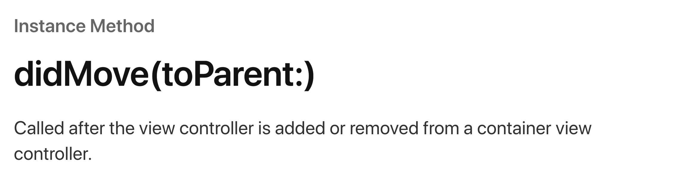사용 예시를 들자면, [자식 뷰 컨트롤러].didMove(toParent: [부모 뷰 컨트롤러]) 와 같은 방식으로 사용될 수 있습니다.