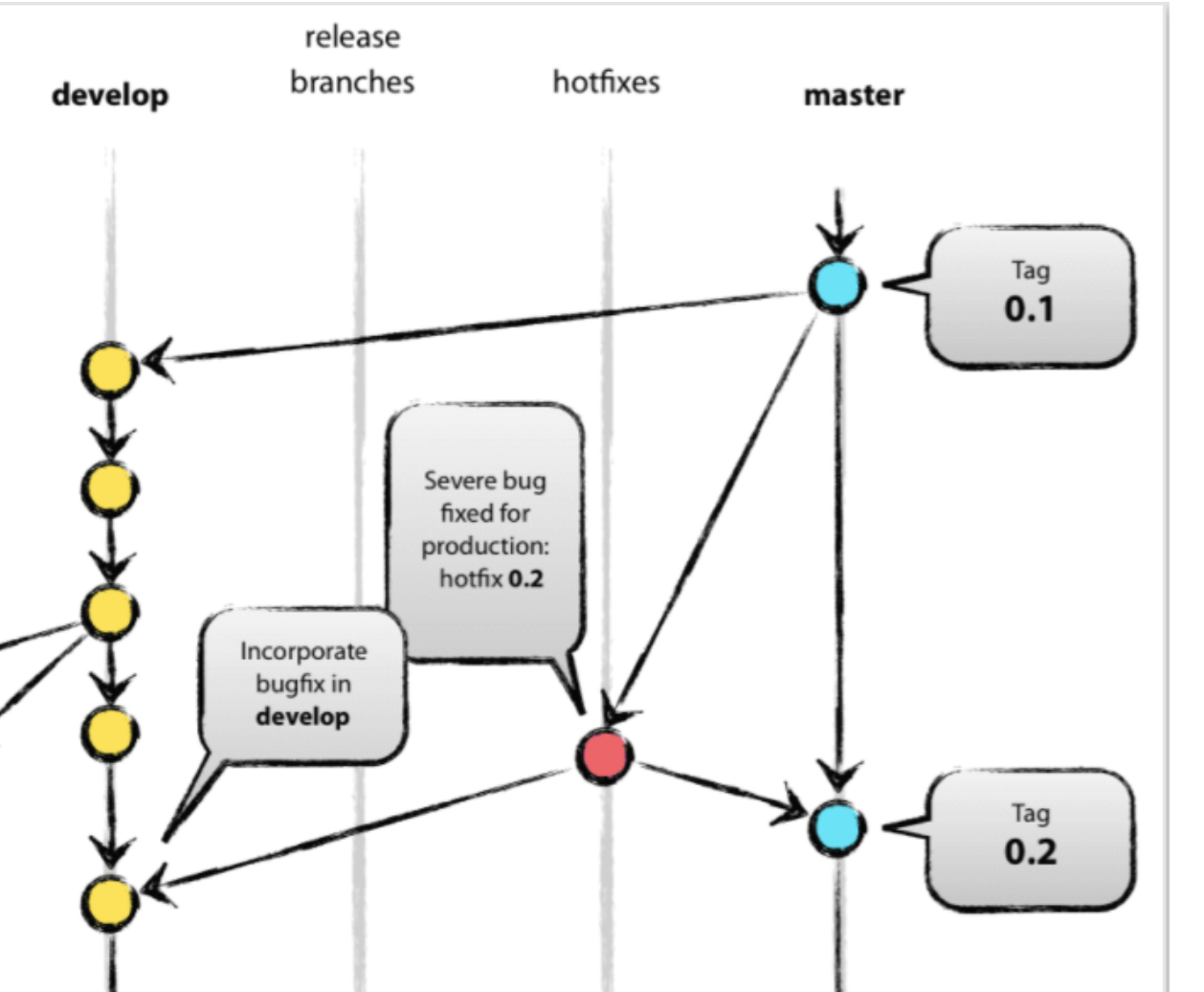 - master에서 급한 이슈가 발생했을때 : 운영중인 서비스앱이 긴급한 이슈가 발생할 수 있죠. 이럴때는 정형적인 절차를 거치면 매우 시간이 부족할 수 있겠습니다. 이때는 hotfix 브랜치를 통해서 긴급이슈를 수정하고 master로 다시 merge하는 방식으로 master가 바뀌기도 합니다. 이건 회사 사정에 따라 급하게 master 브랜치에서 수정작업을 할 수도 있겠지만, 가능하면 hotfix의 절차는 거치는게 안전할 것 같아요. master는 가능하면 건들지 않는것이 안전하겠죠?