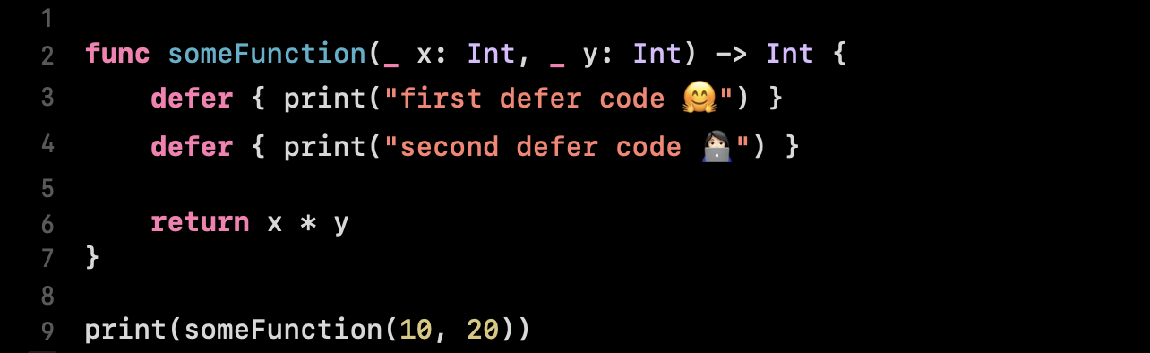 defer문을 직접 swit 코드로 작성해서 사용해 보겠습니다. defer문의 사용 예시는 아래와 같습니다.