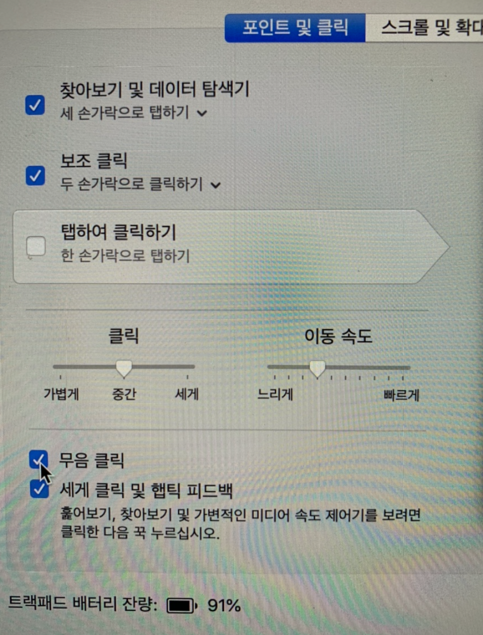 이번에는 spotlight -> "트랙패드" 진입 후에 다양한 트랙패드 설정을 하실 수 있어요. 맥북프로의 패드 설정과 매우 유사하게 설정하실 수 있어요. 입맛따라 패드 설정을 해줍니다.