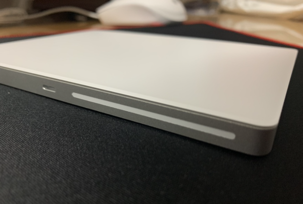위 사진에 스위치가 보이시나요?? 중앙에 충전구도 보이시죠? 애플 매직트랙패드2 제품은 뒷면에 전원스위치와 8핀 충전구가 있습니다.
