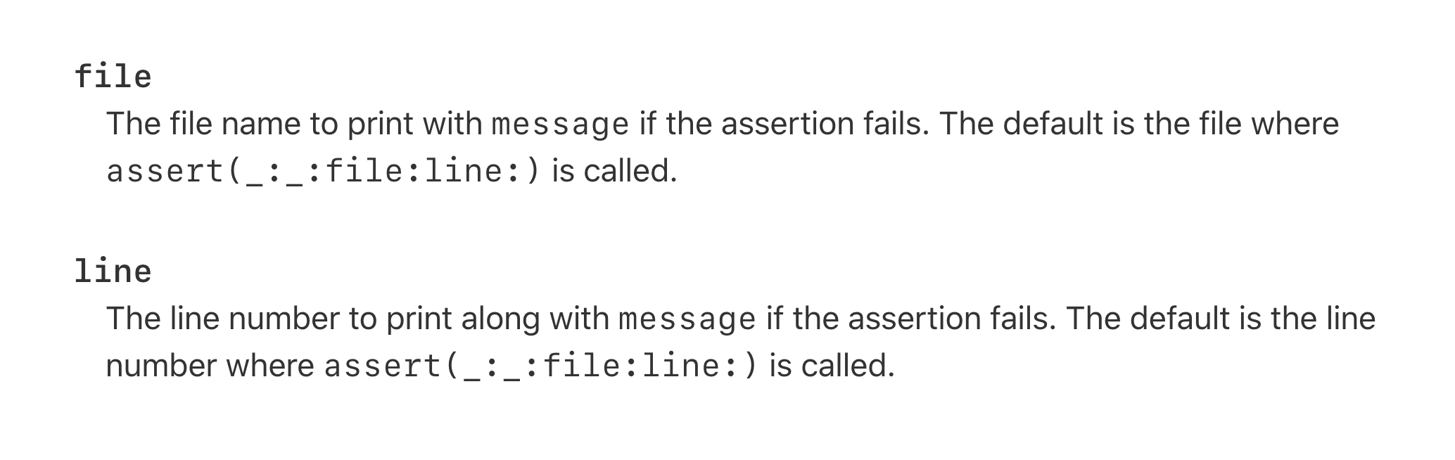 1) 첫번째 인자인 condition입니다. 첫번째 인자로 assert 메서드는 해당 인자에 대한 조건을 체크하게 됩니다. 플레이 그라운드, -Onone 빌드 상에서만 평가되며, 실제 배포된 앱 성능에는 영향을 미치지 않습니다.