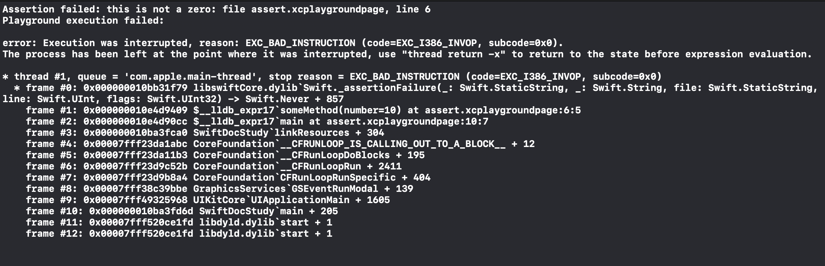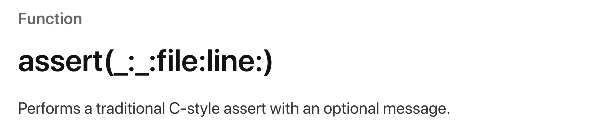 swift의 문법 중 하나인 assert입니다. assert는 전통적으로 C 스타일의 assert문을 메세지와 함께 넣어서 사용할 수 있게 해줍니다.