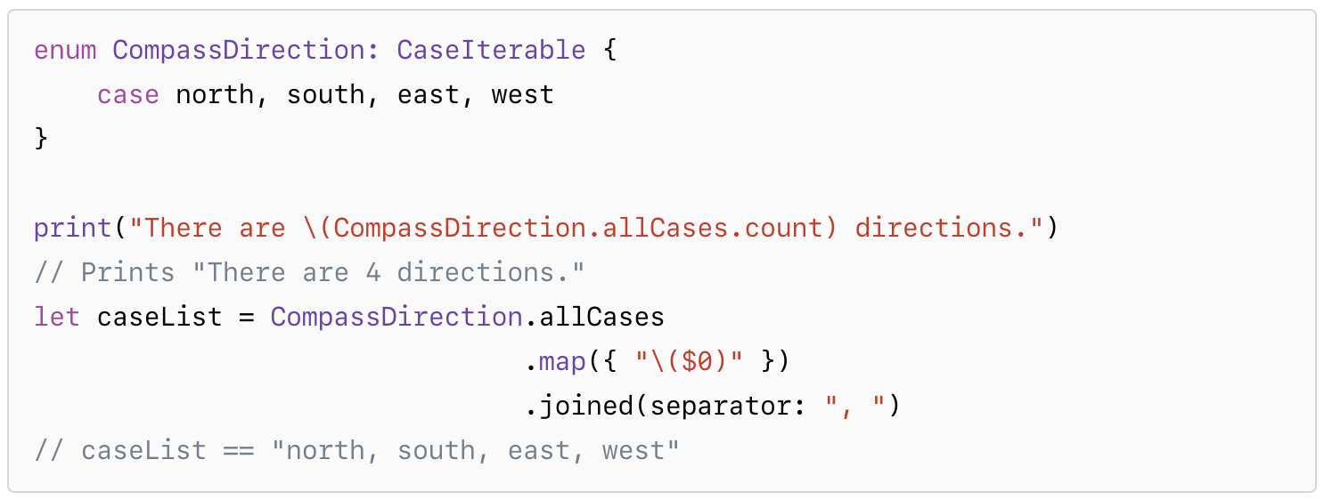 위의 코드를 보면, 현재 case의 갯수를 count을 통해 출력하고, CompassDirection의 타입 프로퍼티인 allCases를 통해서 전체 case 값을 배열처럼 다루고 있습니다. 각각의 case를 문자열로 변환 후에 ", " 단위로 합친 후, caseList에 저장하고 있습니다.