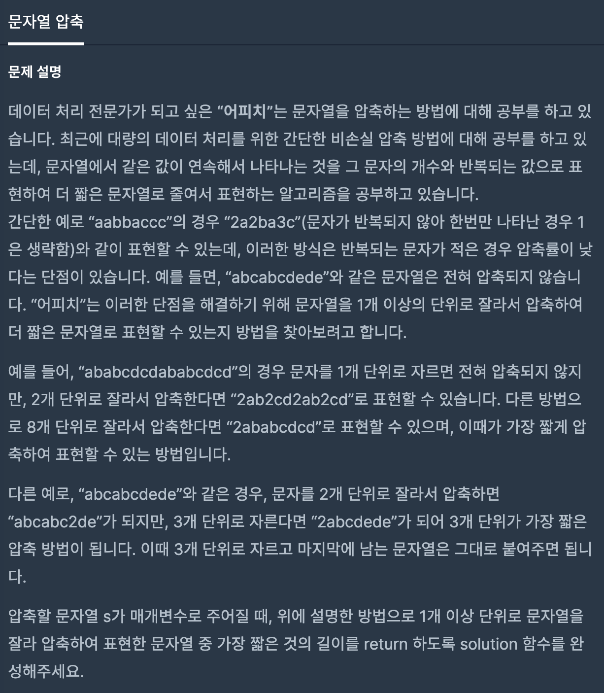 카카오 코딩테스트 기출, 문자열 압축 문제 설명