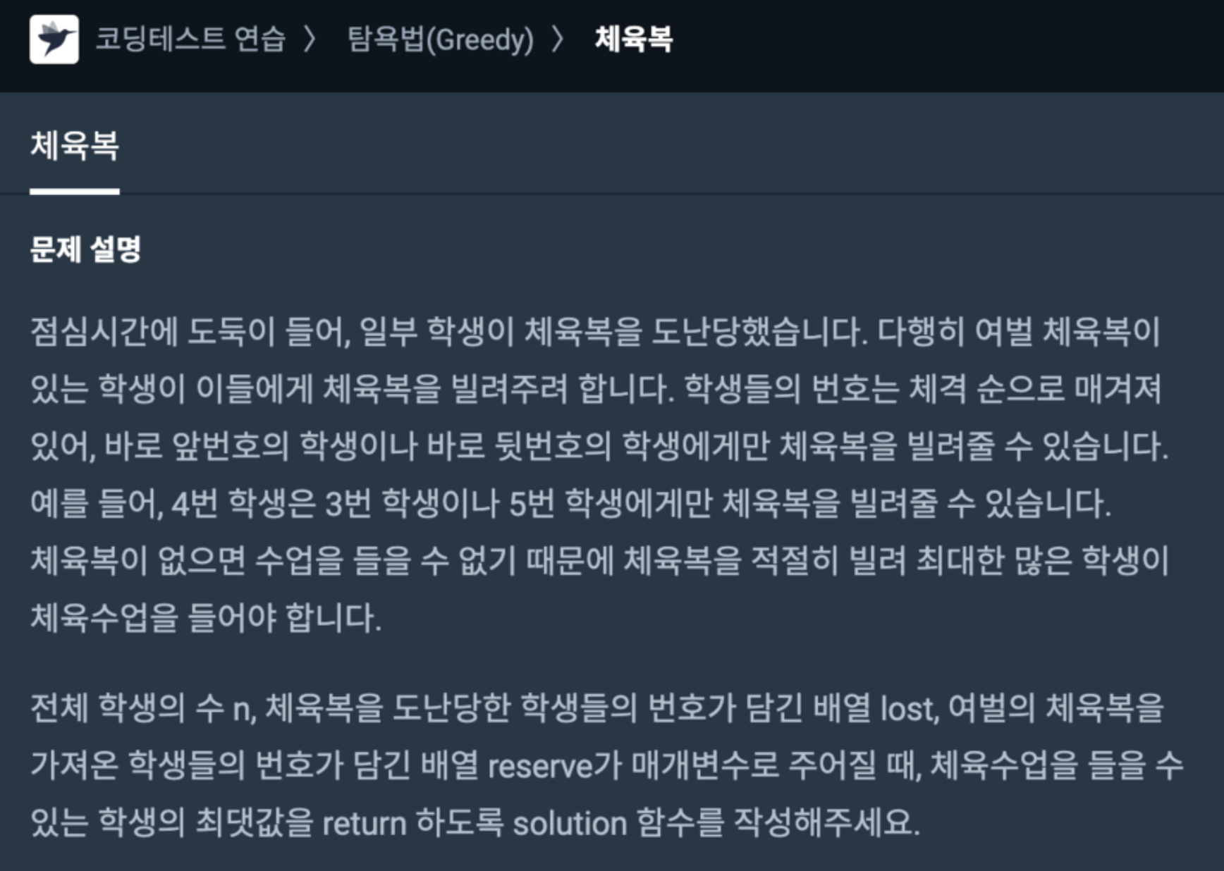 오늘은 탐욕법 알고리즘문제, 체육복을 풀어보겠습니다. 프로그래머스 알고리즘 문제 사이트에 있는 1단계문제 중 하나로, 왕초보분들은 풀이에 약간 어려움이 있을 수 있는 문제인것 같습니다. 이 문제는 탐욕법 문제라고 하는데요.
