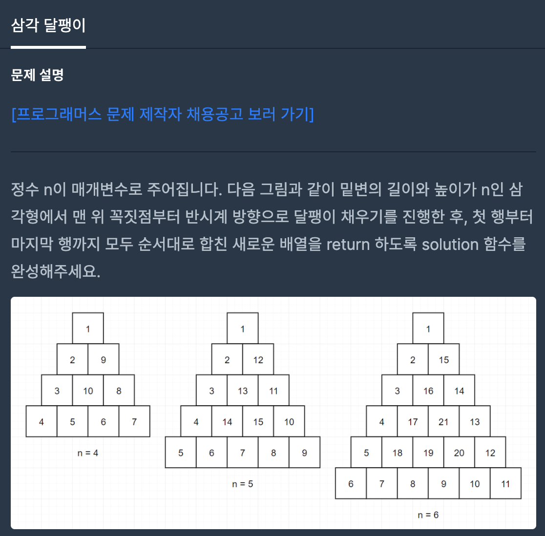 삼각달팽이는 정수 n이 값으로 주어졌을때, 밑변의 길이와 높이가 n인 삼각형에서 맨 윗 꼭짓점부터 반시계 방향으로 달팽이 채우기를 한 후, 첫 행 ~ 마지막 행짜기 모두 순서대로 값을 합친 1차원 배열을 답으로 제출하는 문제입니다.