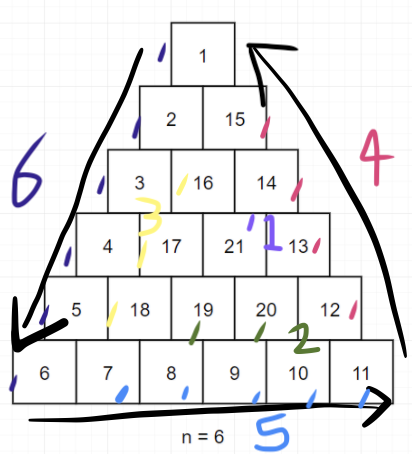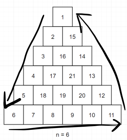 그렇게 하면, n, n-1, n-2 ... 1의 순서로 값을 순회하면서 방향 전황 및 숫자채우리를 진행하게 되겠죠?