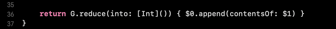 36행) G.reduce는 이차원배열, G에 있는 1차원 배열들을 순차적으로 순회하면서 초기값, [Int]()배열에 누적시킵니다. 결과적으로 [Int]타입의 1차월 배열을 반환하게 됩니다.