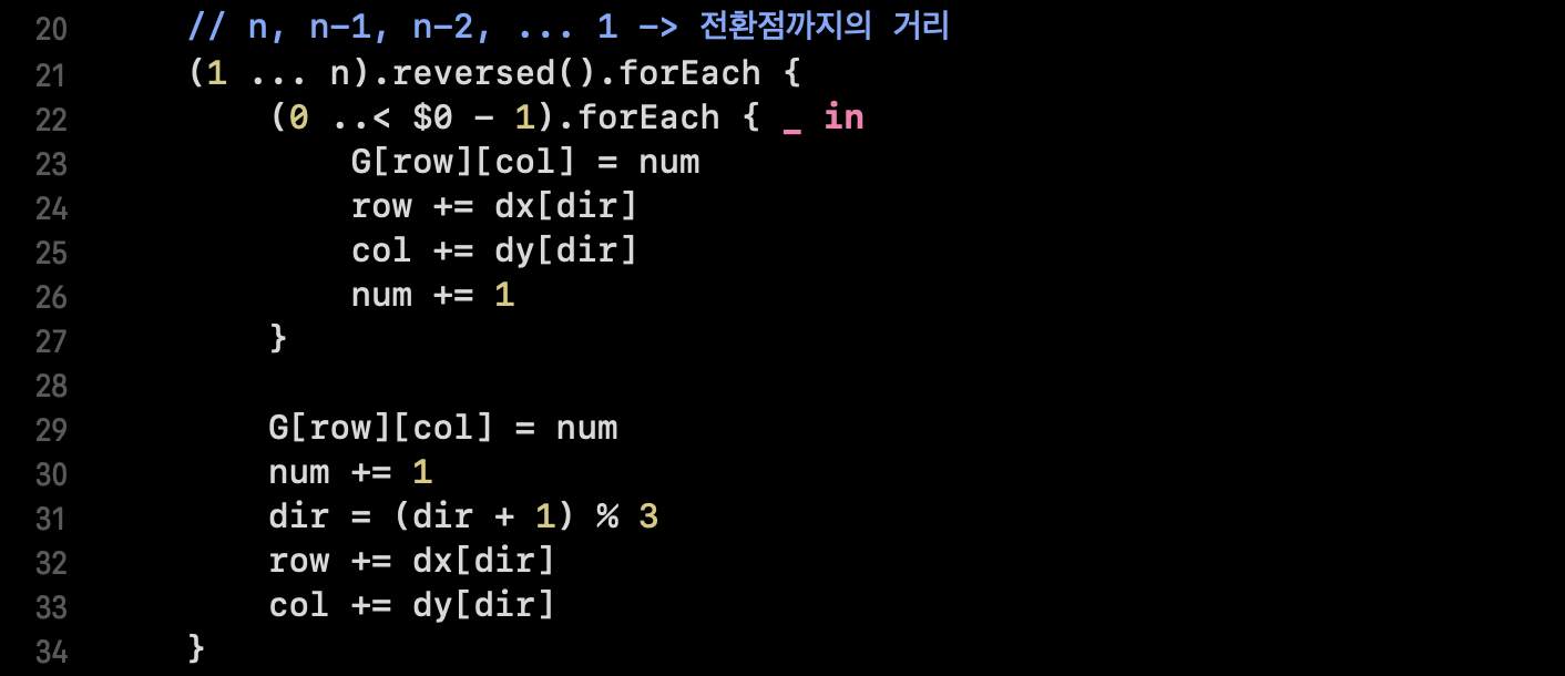 바로 swift언어로 해당 문제, 삼각달팽이를 풀어보겠습니다.