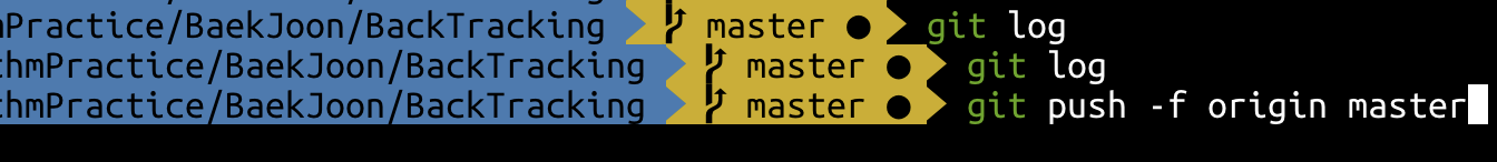 여기까지 진행하면 로컬저장소에만 수정된 커밋이 있는 상태입니다. 이제 원격저장소에 수정한 커밋을 다시 원격저장소로 올려야겠죠? 원격저장소로 커밋을 올려봅니다. 로컬저장소의 커밋기록 상태를 그대로 원격저장소에 강제로 올리겠습니다.