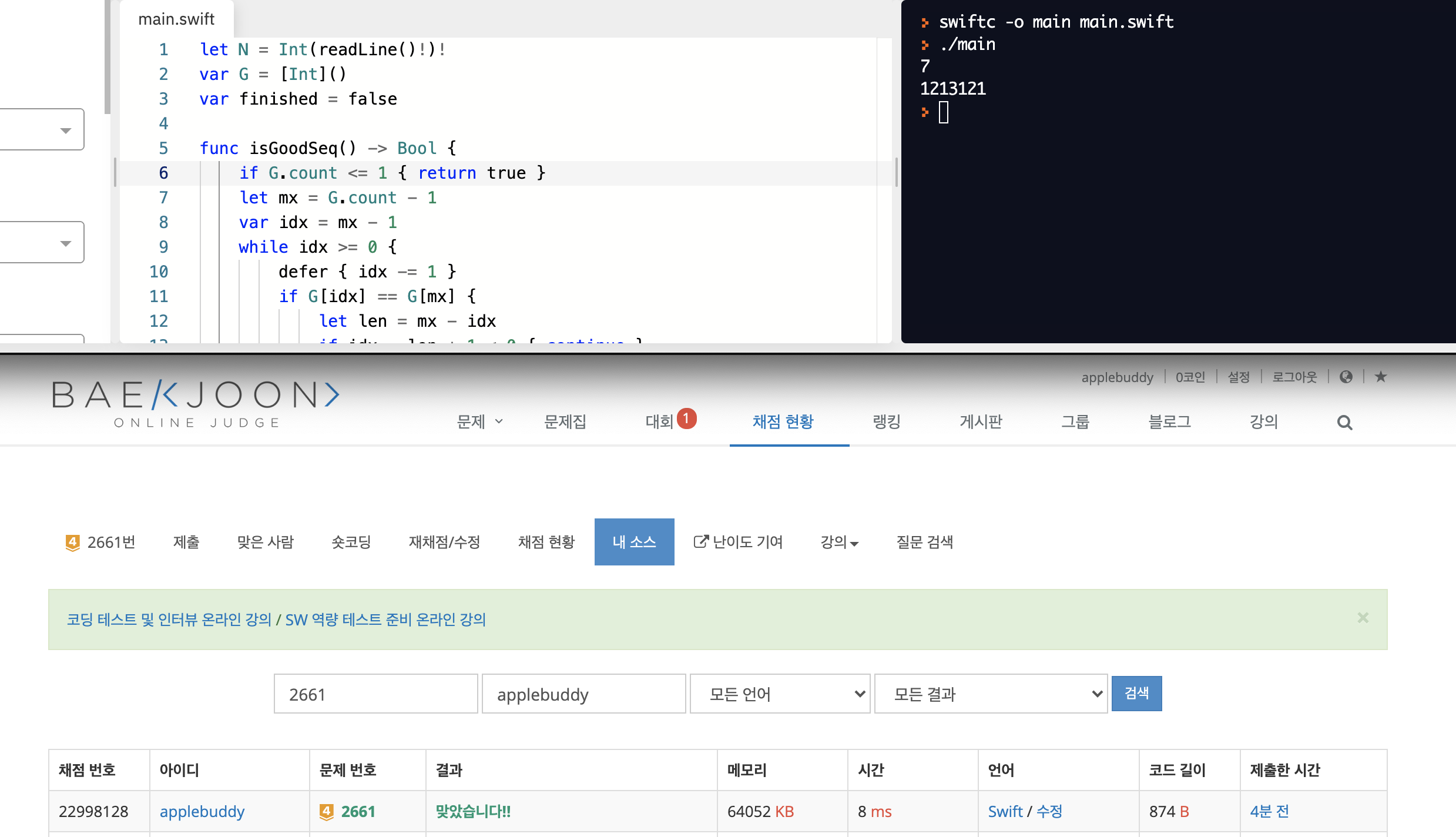 모니터가 별도로 없을때에는 위와 같이 온라인 IDE로 문제를 푼 후에 소스코드 제출을 하고 github에 형상관리를 할 때에만 Xcode로 파일저장 후 push를 올리곤 합니다.