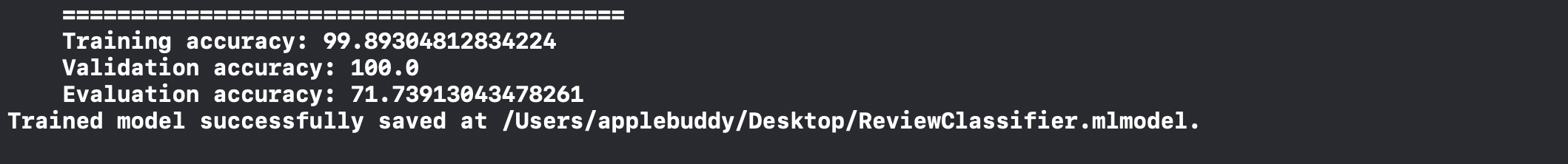 "Trained model successfully saved at /Users/{사용자 이름}/Desktop/ReviewClassifier.mlmodel" 문구가 나오면, 정상적으로 해당 경로에 MLModel파일이 저장되었음을 의미합니다.