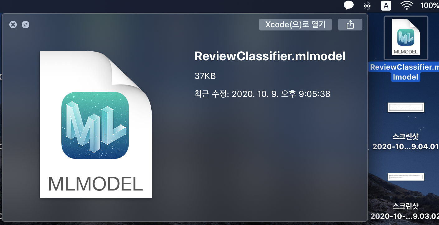 위와 같이 정상적으로 ReviewClassifier.mlmodel 파일이 저장, 생성되었음을 확인할 수 있습니다.