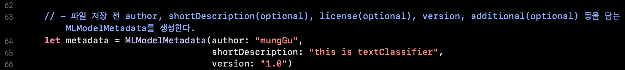 MLModelMetadata타입으로 생성된 metadata는 MLModel 파일 저장 시 MLModel과 함께 저장되도록 합니다.
