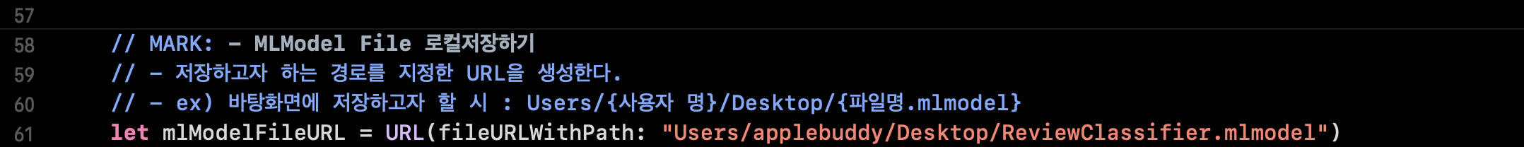 먼저, MLModel을 저장할 경로를 지정합니다. 저의 경우, 바탕화면에 저장하도록 URL을 지정했습니다. URL구조체의 생성자 인자에 지정한 URL경로를 넣어서 URL을 지정합니다.