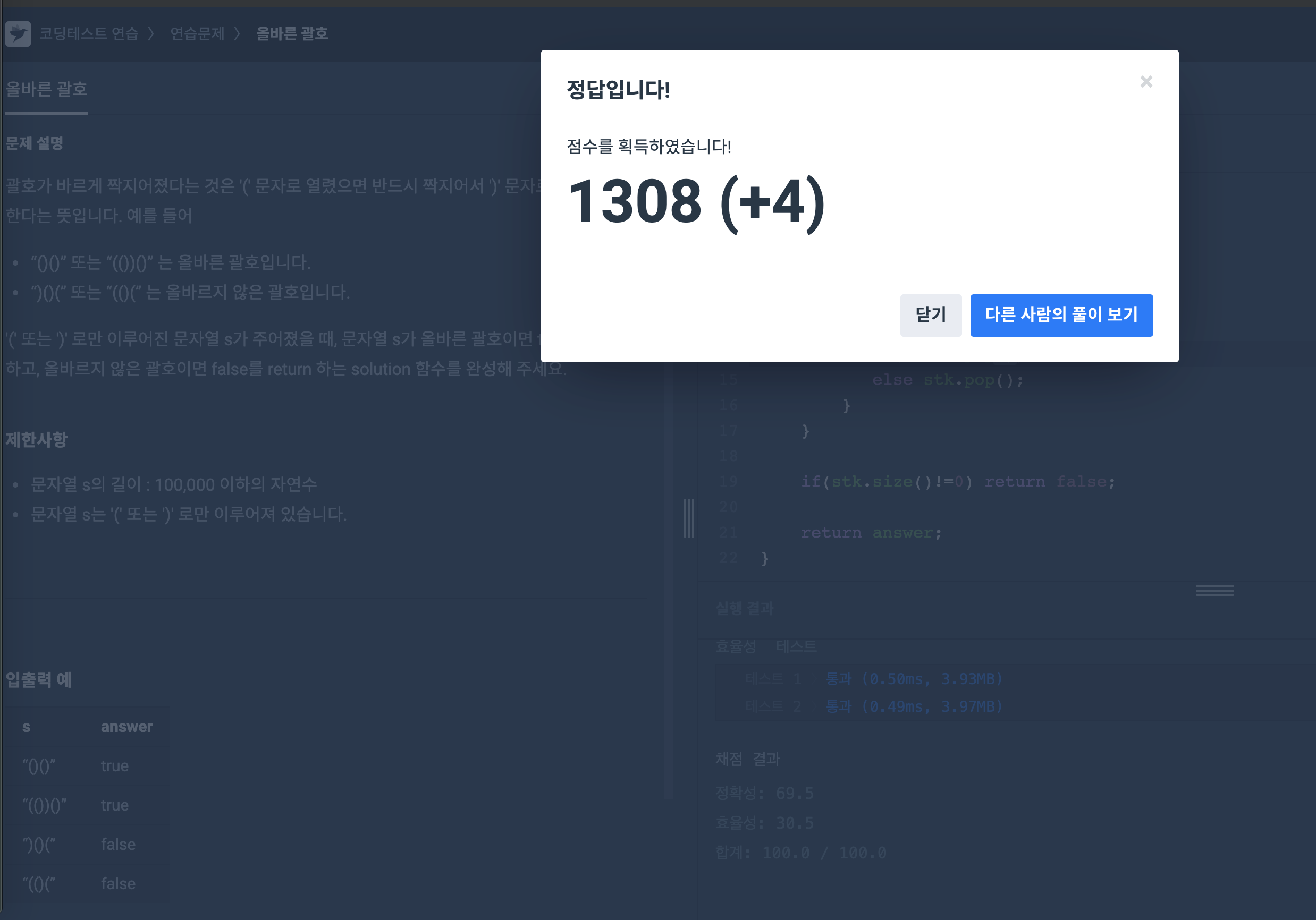 이 문제, "올바른 괄호" 알고리즘 코딩 문제는 "기능개발" 보다 3배는 쉬웠던것 같습니다.