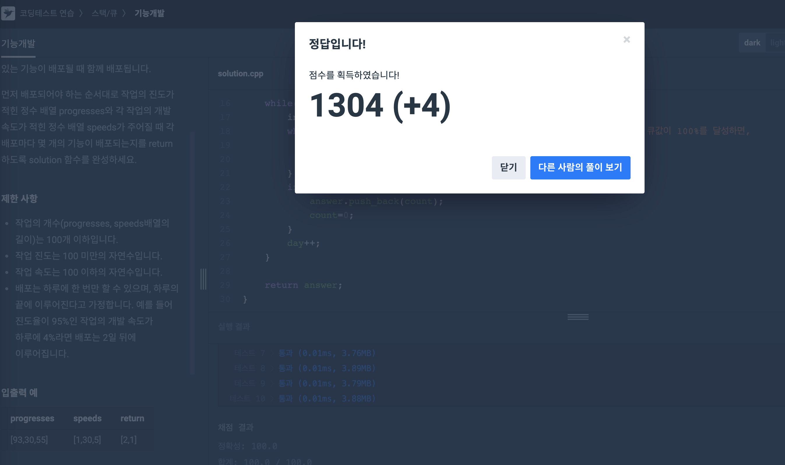 그래도 확실히 문제를 풀면 풀수록 그림도 그려지고, 문제를 뭐로풀어야할 지 갈피가 잡히기도 합니다. 최근엔 스택/큐 알고리즘 문제를 몇개 해결했는데 첫번째로 "기능개발" 스택/큐 문제를 풀었습니다. 이 문제는 queue<pair<xxx,xxx>> q를 통해 가볍게 풀 수 있었습니다. 문제를 하나씩 풀다보면 한번은 꼭 실수가 있어 틀리곤 하는데 한번에 성공해서 되게 기분 좋았어요. 이 외에도 map, priority_queue, stack, vector등 다양한 타입을 사용해서 문제를 풀어볼 수 있어서 좋은 것 같습니다.