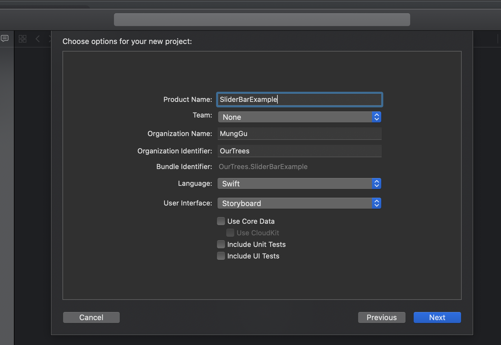 프로젝트 이름은 재량껏 자유롭게 만드시면 되겠습니다. 저같은 경우, SliderBarExample로 만들었었네요.