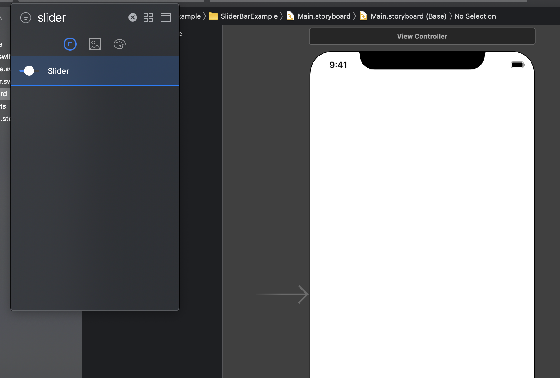 프로젝트를 생성하셨다면, Interface Builder의 스토리보드 화면에 UISlider를 배치하겠습니다. Command + Shift + L을 사용한 후, slider를 검색해서 드래그, 스토리보드에 옮겨줍니다.