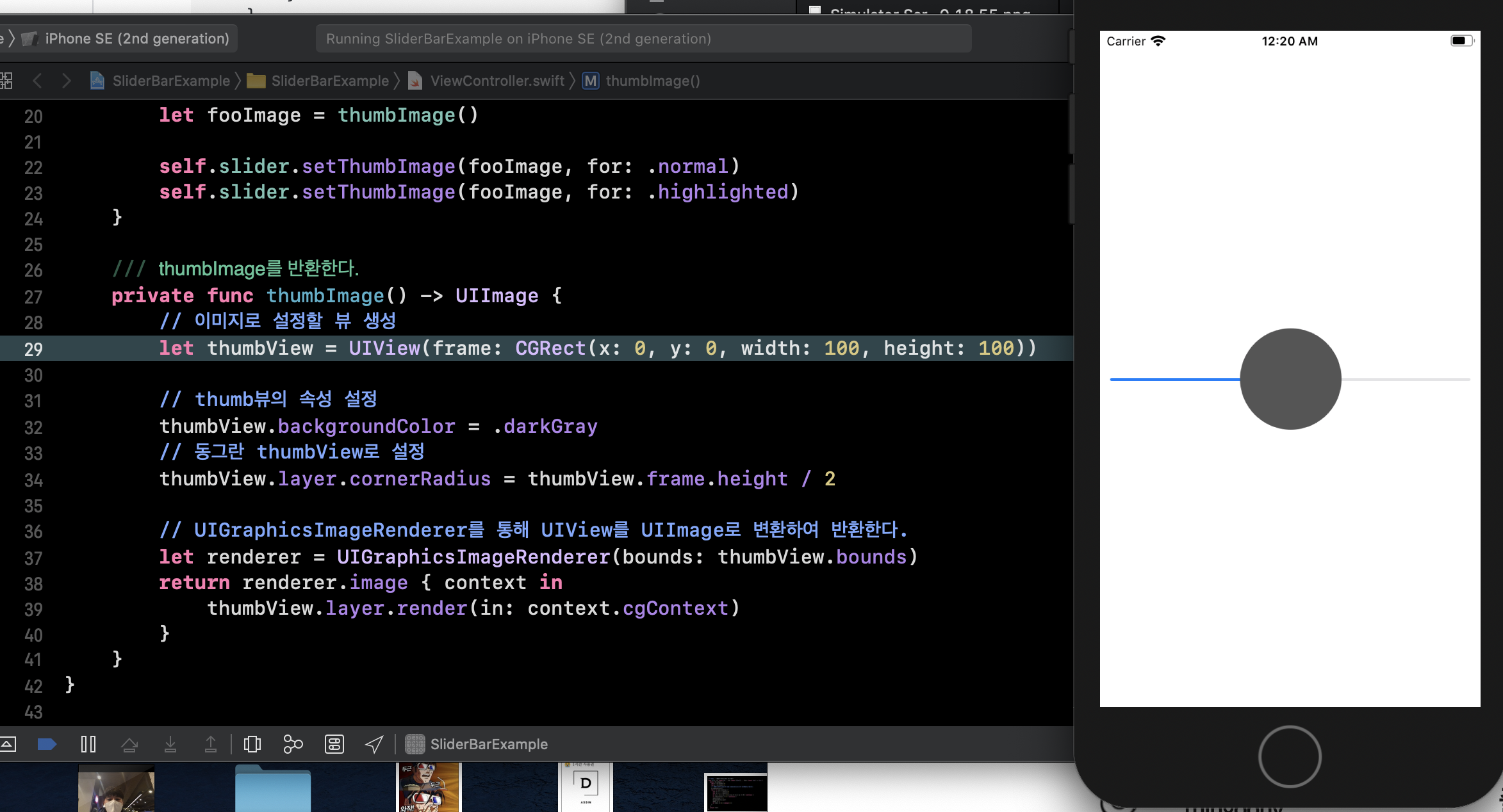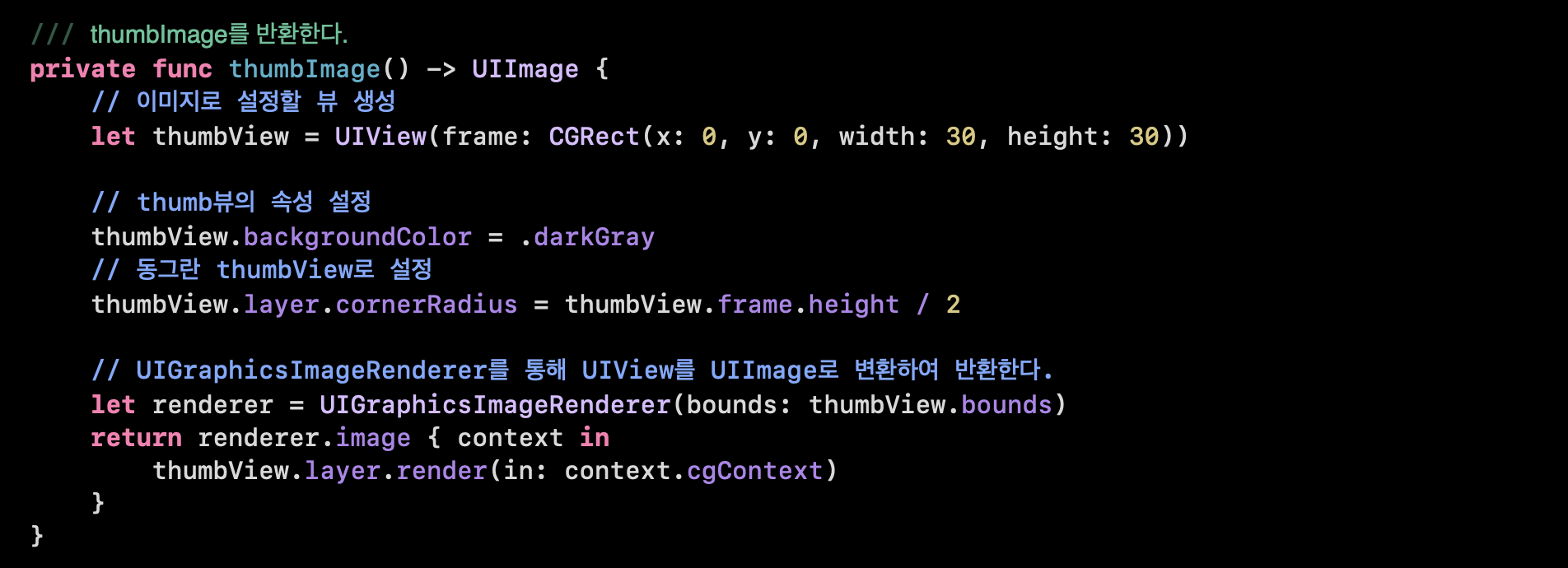 여기에서 UIImage() 대신 self.thumbImage()를 대체해줍니다. 앞서 만들었던 커스텀 이미지를 받아오는 것이지요.