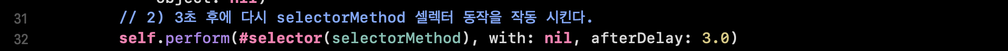 // -> 특정 시간 이후 셀렉터 동작을 실행하고 싶으면 NSObject의 perform메서드를 활용할 수 있다.