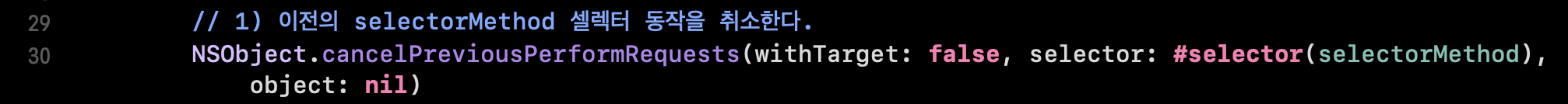 1. NSObject.cancelPreviousPerformRequests ... : 이전의 셀렉터 동작을 취소한다.