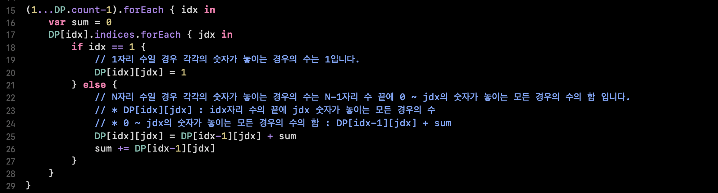 21행) idx > 1일 경우에는 점화식을 적용하게 됩니다. 점화식은 DP[idx][jdx] = DP[idx-1][jdx] + sum(idx-1 자리에서 0 ... jdx-1 의 숫자를 두는 모든 경우의 수) 가 됩니다.