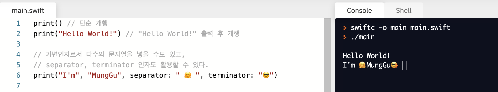 swift에서 출력을 할때는 무엇을 사용할까요? 바로 print() 입니다.