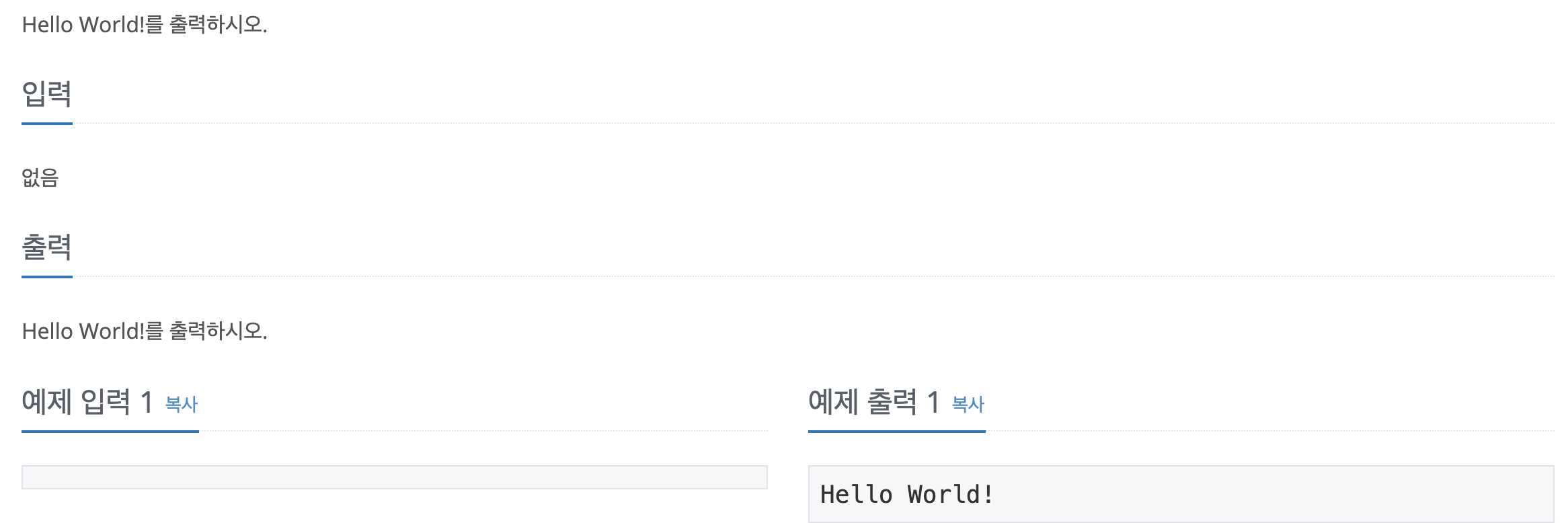 Hello World는 말 그대로, "Hello World"를 출력하면 되는 문제입니다.