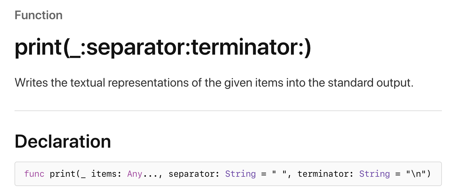 아래 swift 공식 문서의 print() 메서드 정의 설명을 보겠습니다.