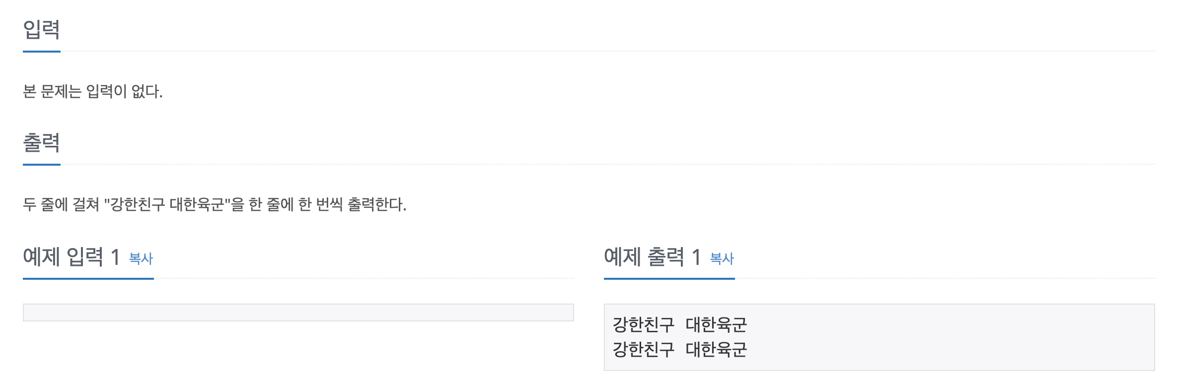 별도 입력을 받을 필요가 없으므로, 해당 문제 또한 입력 메서드, readLine()은 필요 없습니다. print()문만 사용하면 되지요. 출력 예시를 보시면 "강한친구 대한육군"을 2행에 걸쳐서 출력하라고 하고 있습니다.
