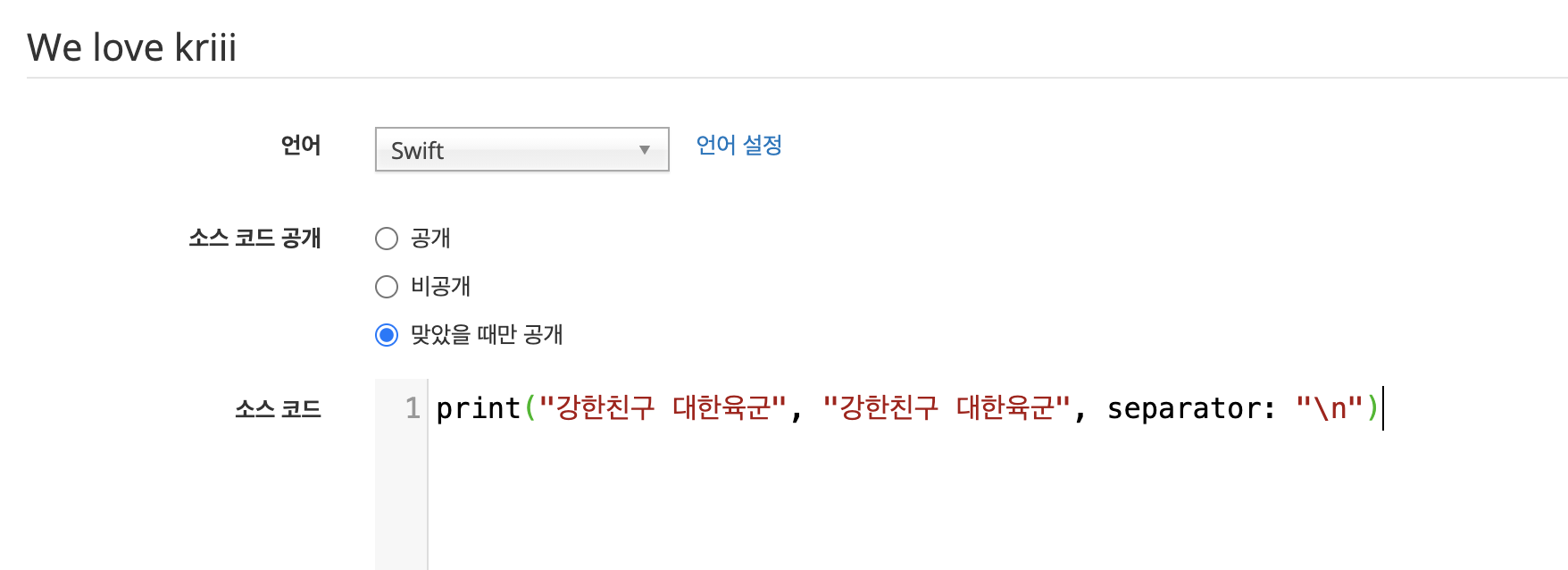 We love kriii 또한 백준의 기본 출력 문제입니다. 입/출력 예시도 이어서 보겠습니다.