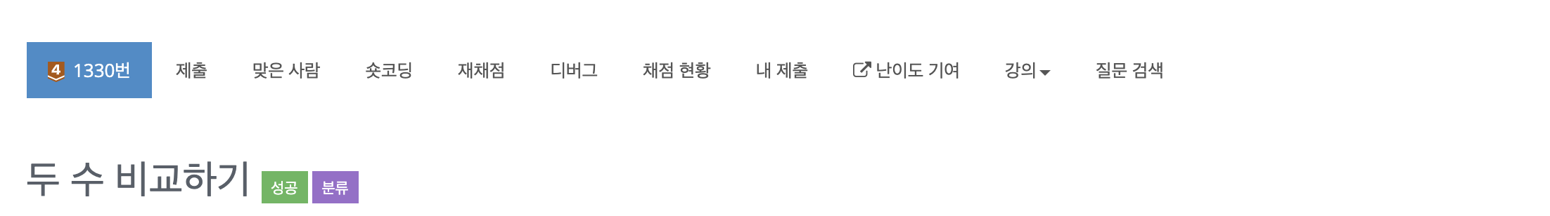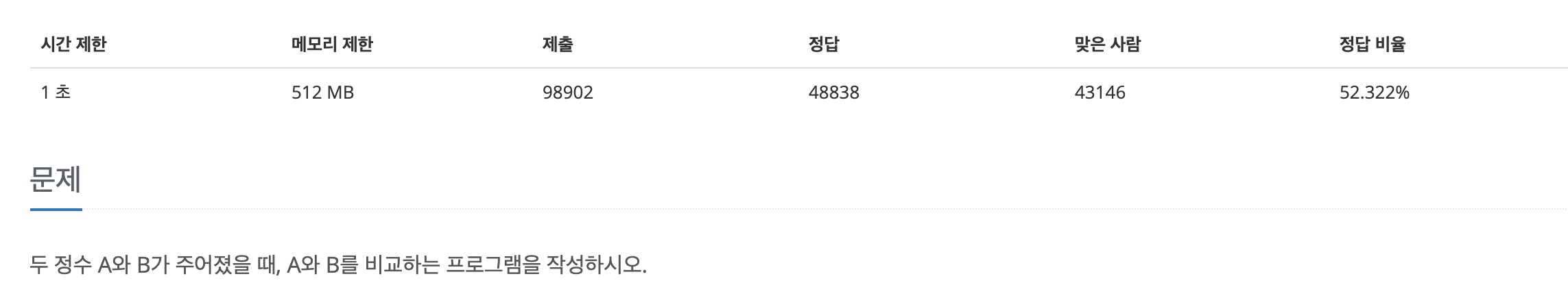 백준 1330번, 두 수 비교하기는 말 그대로 두 수를 입력 받아 어느 수가 큰지를 출력하면 되는 문제입니다.