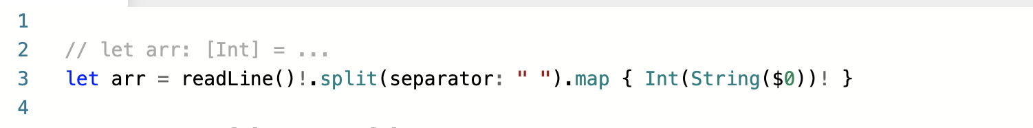3행) readLine()의 반환값, String? 의 옵셔널을 벗기기 위해 readLine()! 로 강제언래핑을 해준 뒤, 특정 문자를 기준으로 쪼개주는 함수인 split과 배열 내의 각각의 값을 특정 연산으로 변환시켜주는, 매핑해주는 map을 사용해서 String? -> String -> [Int] 로 변환을 시켜준 뒤, arr에 넣어줍니다. 이렇게 arr은 Int타입의 배열을 갖게 됩니다.