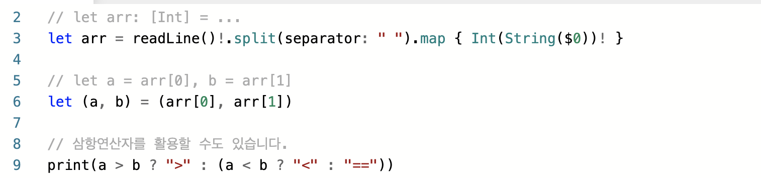 swift의 조건문, if문이나 삼항연산자를 사용해서 입력 받은 두 수의 비교결과를 출력하는 백준 문제를 풀어보겠습니다.