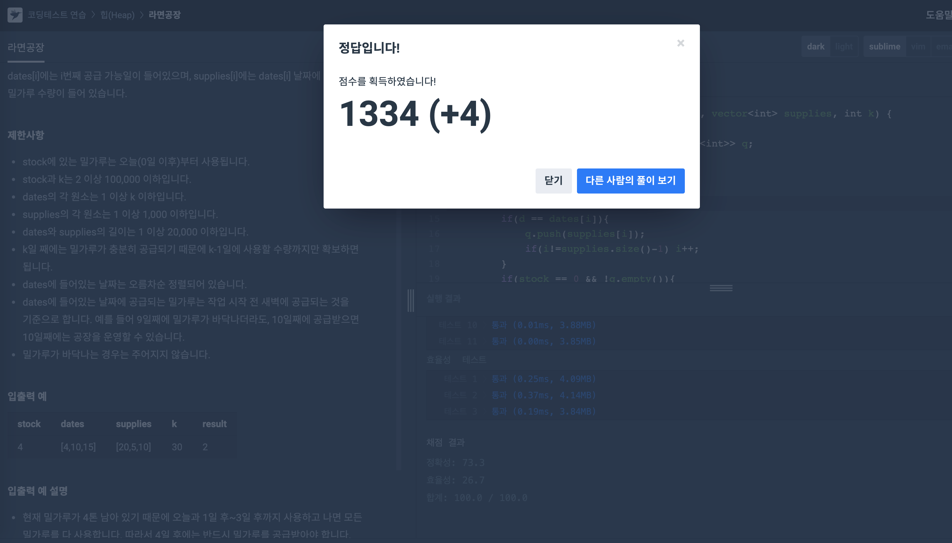 라면공장문제는 현재 밀가루재고(int stock), 추가밀가루공급가능일(vector<int> dates), 공급가능일 별 공급가능한 밀가루량(vector<int> supplies), 밀가루공급해야하는 일수(int k)를 참고해서 최소로 밀가루 공급을 받는 횟수를 결과로 출력하는 힙(Heap) 응용문제였습니다.